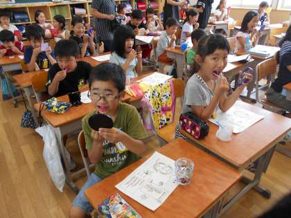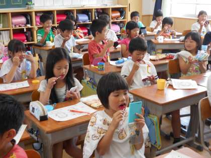 保健委員会による染め出しがありました。給食後きれいに磨いたはずなのに,歯が液で真っ赤に染まりました。手鏡を見ながら,磨き残しを一生懸命磨いていました。明日からは,しっかり磨けるかな?