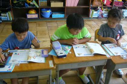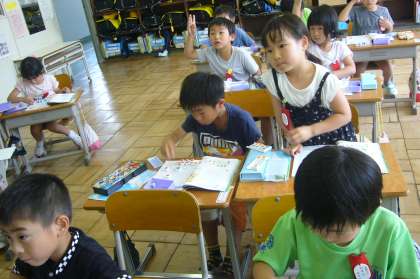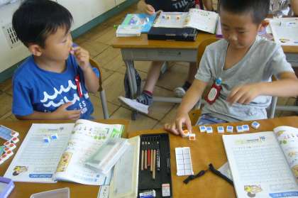 教科書の挿絵、たしざんのカードを見ながら、「10」になるものや「8」になるものをさがし、たしざんの確かめをしました。