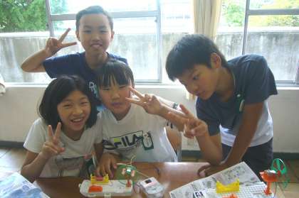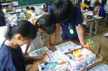 かん電池の向きを変えるとモーターの回る向きはどうなるか、キットを使って調べました。