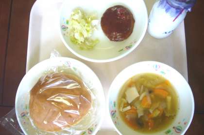 今日はハンバーグのトマトソースかけとサンドイッチバンズパンでした。