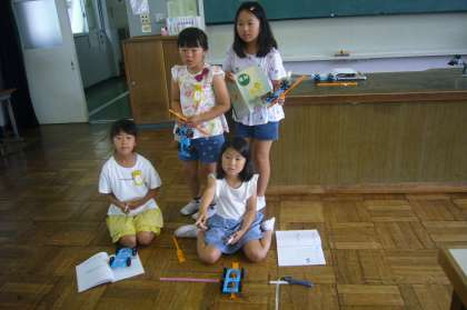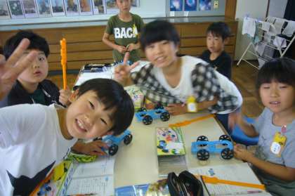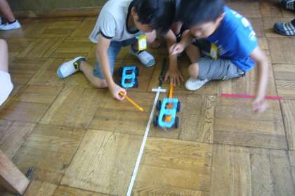 ゴムを車に引っかけて、ゴムを張る長さによって車の移動距離がどう違うのかを調べました。