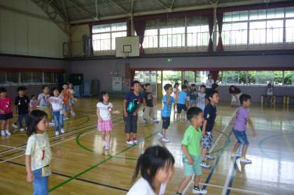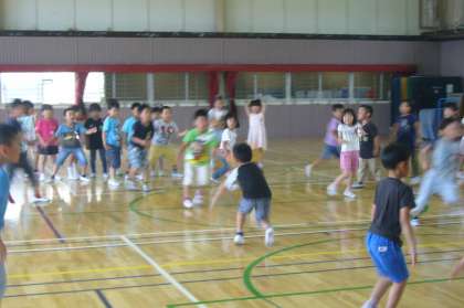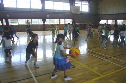 投げたり逃げたり受け止めたりと、二つのボールで楽しくドッジボールをしました。