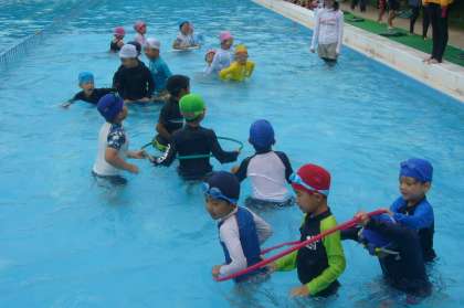 輪で列車遊びをしたりビート板を使って顔つけやバタ足、浮かびの練習をしました。