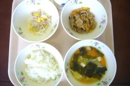 今日はわかめスープでした。やさしい味の汁物でおいしかったです。5〜6月の初鰹、旬のおいしい鰹のしょうがやきは臭みなしでごはんによく合いました。豚肉のキムチ炒めはキムチのうまみと辛みがほどよく効き、春雨の酢の物はほのかな酢の香りとはるさめの食感がよかったです。