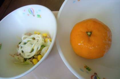 トマトをベースにした親しみある味で、むぎご飯をまぜていただきました。ツナサラダは、キャベツ、コーン、キュウリにマヨネーズを和えていただきました。冷凍みかんは冷え冷えでおいしかったです。