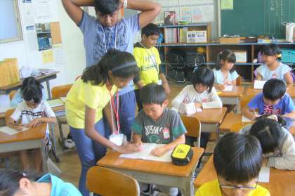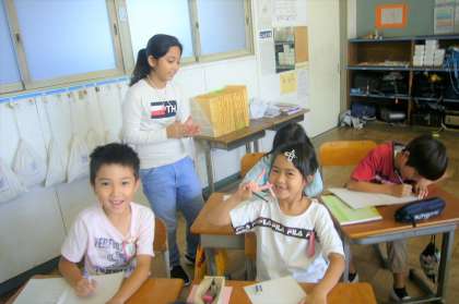 アルファベットのAからB・C・D・E・F・Gまで、その文字がつくものを探して答えたり、絵を描いたりして学びました。