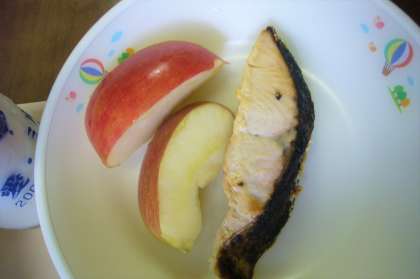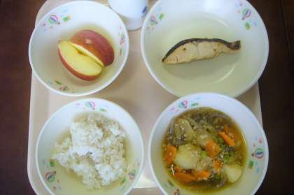 今日はむぎごはんでした。麦は米に比べると食物繊維やタンパク質、ビタミンなどの含有量が高いといわれています。しっかり噛んでおいしくいただきました。じゃがいものそぼろ煮は、ぶた肉のそぼろと、じゃがいも、玉ねぎ、にんじん、こんにゃく、グリーンピースがさとうとしょうがで調えられ、お汁たっぷりでおいしかったです。さけのみそマヨネーズ焼きは、みそとマヨネーズのソースが抜群でした。りんごもおいしくいただきました。