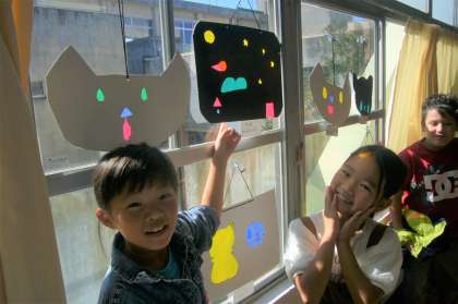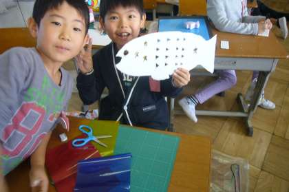 台紙に色つきセロハンをはりつけ、光を通すと・・・。
