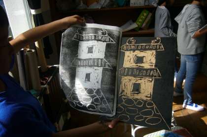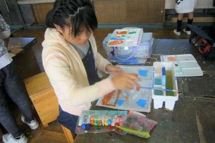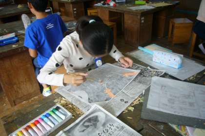 黒インクで刷ったり刷った和紙の裏に絵の具で色をつけたりしました。