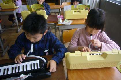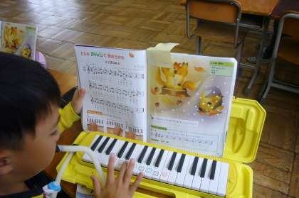 鍵盤ハーモニカで「こぎつね」を練習しています。