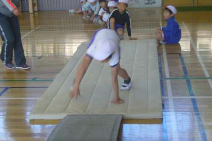 マットの上でアシカやチーター、カンガルーやウサギなどの動物の歩き方をまね、両足跳びで跳び箱1段に飛び乗り、両足降りで着地してポーズ!