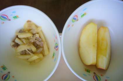 今日は冬野菜のクリームシチューでした。やわらかい優しい味は寒さを吹き飛ばし、心もほんわかとあたたかくなるおいしさでした。ロールパンに付けて食べても抜群でした。ジャーマンポテトとりんごもおいしくいただきました。