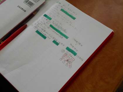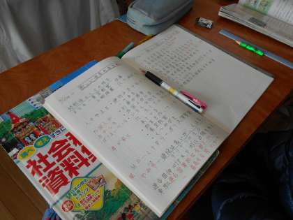 先生の話を聞き、考えます。そして、自分の考えを発言したり、友達の考えを聞いたりして、さらに考えます。学習したことをノートにまとめることで、頭の中を整理します。まとめながら、覚えることをチェックし、同時に覚えるためのノートづくりをしている児童もいました。
