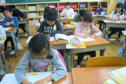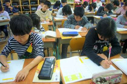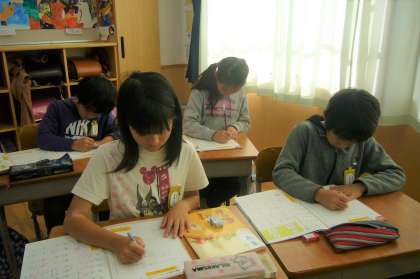 姿勢をただし、文字の配列に気をつけ、ていねいに書いています。