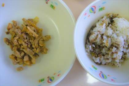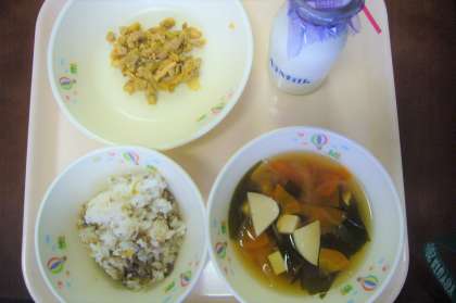 今日はかまぼこのすまし汁でした。やわらかくやさしい味のお吸い物でした。ごはんはソースそぼろごはんのぐ具を混ぜ合わせ、鶏肉のうまみとキムチの辛みがほどよく効きいた鶏肉のキムチ炒めといっしょにおいしくいただきました。