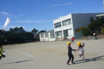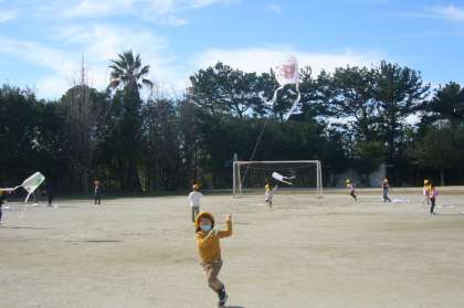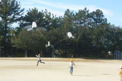 運動場での凧あげは、作った凧が気持ちよく舞い上がり、みんな大満足でした。