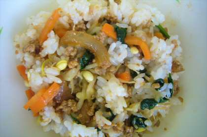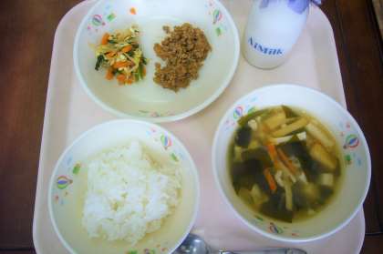 今日はビビンバでした。ショウガとニンニクが入った肉と野菜をごはんにからめ、おいしくいただきました。わかめスープはやさしい味の汁物でおいしかったです。