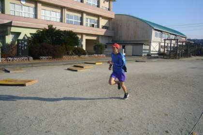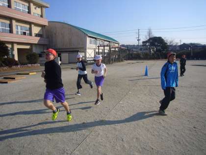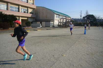 5分間で運動場のトラックをどれだけ走られるか、毎回記録をとって確認しています。