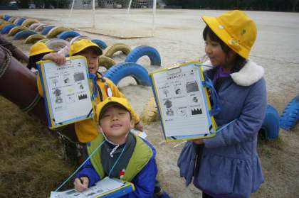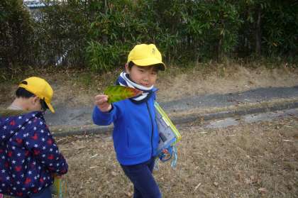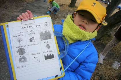 「ふゆさがしビンゴ」のカードに書かれた「落ち葉」や「茶色い草」、「白い息」などを見つけ、ビンゴできたかな?