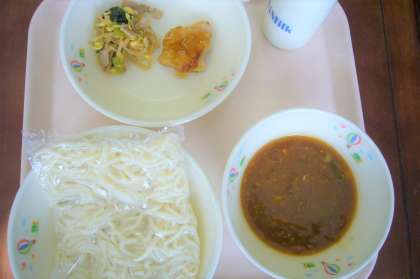 今日はソフトめんでした。にくみそにからめ、おいしくいただきました。鶏の照り焼きは、柔らかい鶏肉にタレがテリっと絡み、野菜炒めはハムと小松菜、大豆もやしが砂糖で調えられ、おいしかったです。