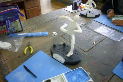 イメージした体の形になるよう、針金の入ったパーツを整え、その骨組みに紙粘土で肉付けをしています。