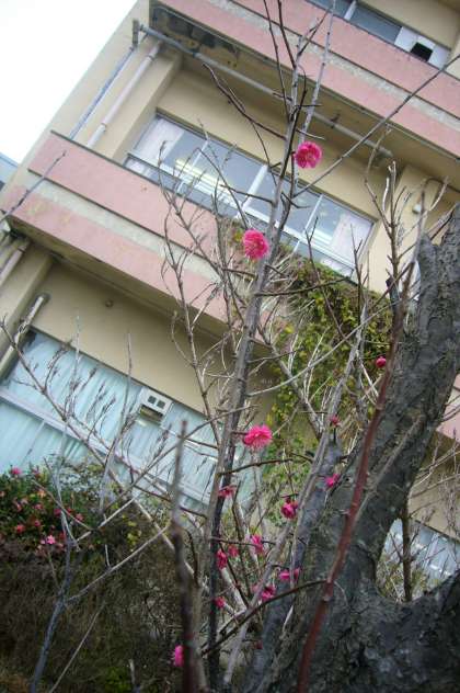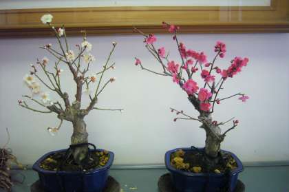 屋外南側の軒先下で水やりをしていた盆梅は5分咲きほどとなり、玄関に取り入れました。
