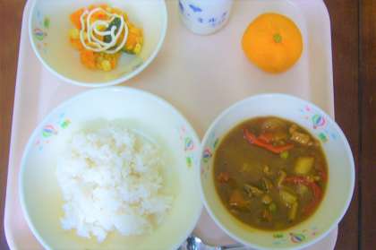 今日はむぎごはんでした。麦は米に比べるとビタミンなどの含有量が高いといわれています。赤ピーマン、かぼちゃ、アーモンド、みかん、と、ビタミンをしっかりいただきました。