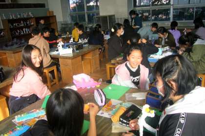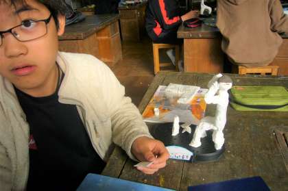 立体作品「12年後の私」の制作、カラー粘土で肉付けをしています。