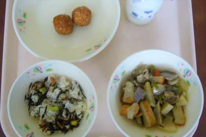 今日はひじきごはんの具と豚肉と野菜の煮物でした。ごはんにひじきごはんの具をまぜ、豚肉と野菜の煮物と交互に食べて、おいしくいただきました。レンコンのシャリシャリ感がいい愛知のレンコン入りつくねもおいしくいただきました。