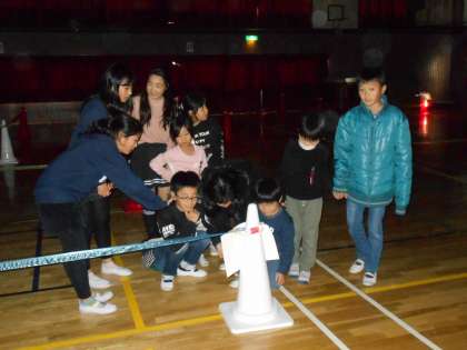 ペアグループごとに体育館に入り、問題を解きながら進む「暗闇迷路」をしました。