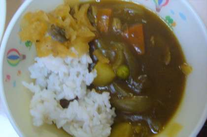 今日は人気の給食メニュー、カレーライスでした。各クラス完食です。げんきサラダには鰹節が入っています。バリバリと、鰹節の食感を楽しみながらいただきました。