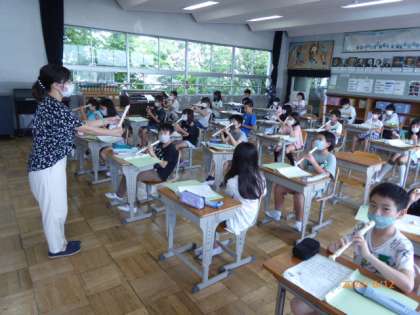 音楽の授業でリコーダーの勉強をしています。でも実際に吹くことはできません。先生が、リコーダーの裏の穴をおさえた親指をほんの少し、髪の毛一本分だけ開けると音の高さが1オクターブ変わることを説明しています。みんなマスクを着けたまま、軽くリコーダーの吹き口をあてて、指使いを練習しています。でも音は出ていません。実際に吹いて確かめることができないのが歯がゆいところです。