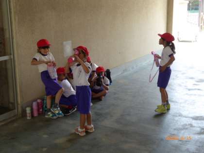 1年2組は、うんていができるかどうか、順番にやってみました。担任の先生はどれだけできるかメモしています。今日はとても暑い日になりました。途中で日かげにおいてある水筒のところへ行ってこまめに給水タイムです。