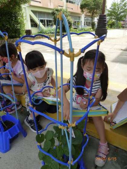 2年2組は育てている野菜の観察をしています。もういくつも実のなっているものもあって、とてもうれしそうに観察記録をかいています。