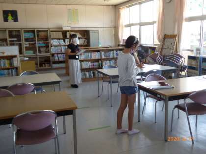 6年生は音楽のリコーダーのテストを図書館で行いました。窓をすべて開けて、さらに扇風機で換気をしながら、先生と児童のふたりだけが入室して行いました。お互いの距離をとり、先生はマスクとフェイスシールドを併用しています。