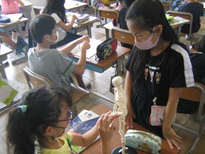 予想した後で、骨の模型を使って曲がるところを確認しながら記録していました。