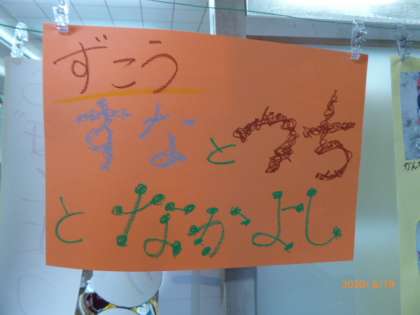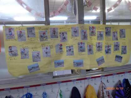1年生の教室前に、鬼崎海岸で活動した「すなと土となかよし」の作品写真が飾られています。鬼崎海岸で一人一人が作った砂の造形とともに写っている記念写真です。
