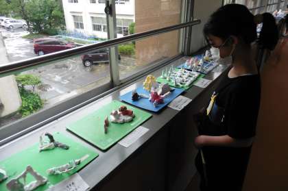 3年生の図工作品「ねんどマイタウン」が2階渡りに生まれました。順番に児童が鑑賞して、鑑賞記録を書いています。