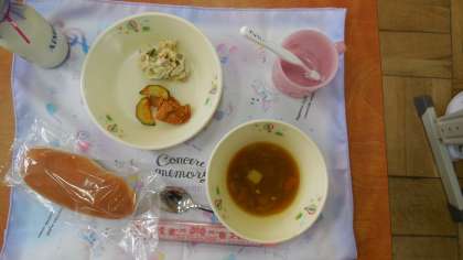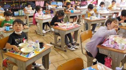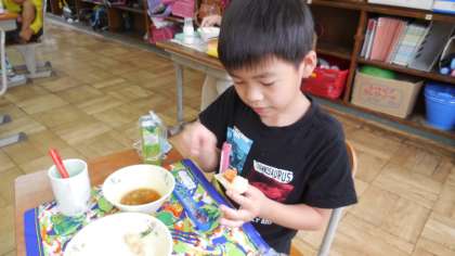 2年生の教室では、パンの食べ方を工夫している子を見かけました。パンをちぎってスープにつけたり、パンの中にサラダをはさんだり・・・楽しく、おいしそうに食べていました。