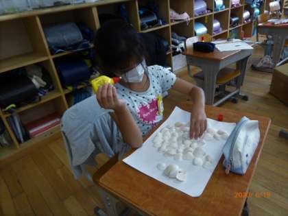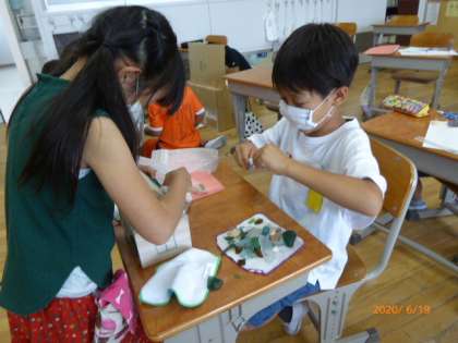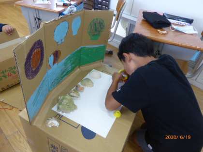 3年生は総合的な学習で、鬼崎海岸で集めてきたいろいろなものを使って作品づくりをしています。なかなかの力作ぞろいです。