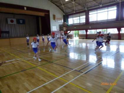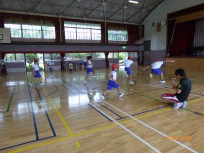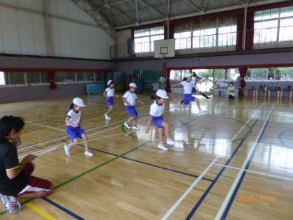 3年1組は体育館で、長なわの跳び越えをしています。長なわをもっている先生と児童が上下になわをふって、長なわが波のようにうねっています。そこを見定めてジャンプして跳び越えます。さあ、だんだん高さが高くなってきました……