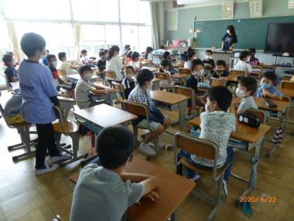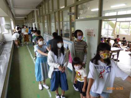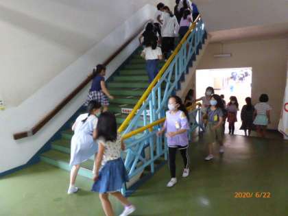風水害避難訓練の続きです。1年生は6年生に連れられて、通学団の教室前の廊下で待機しています。放送で全校の児童が、校内右側通行のルールを守って移動しています。通学団の教室では、今日出席している児童が全員集まることができているか、丁寧に確認をしました。