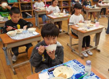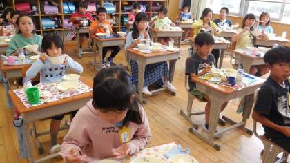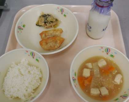 今日は中華のこんだてでした。ごはんとおかずをいっしょにして中華丼にして食べている子もました。あげぎょうざのサクサクとした食感が楽しく、おいしくいただきました。