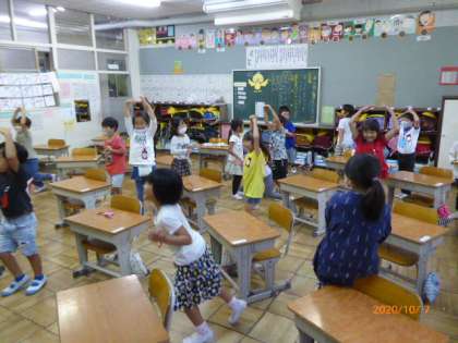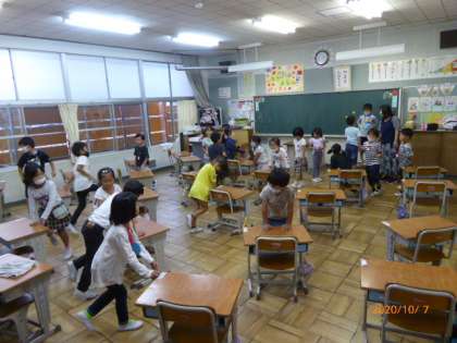 1年1組はゲーム「しんげんち(震源地)」を楽しんでいます。誰かが最初に動き、それをまねてクラス全員が動きます。オニは、だれが最初に動くか、目をこらして見定めています。