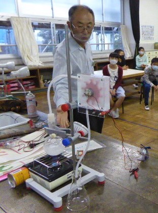 発電所の仕組みについての実験の様子です。フラスコに入った水をガスコンロで熱します。吹き上がった水蒸気がファンを回し、発電機が回って発電します。銅線でつながれたファンがくるくる回る仕組みです。