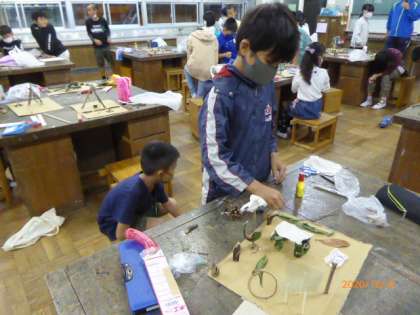4年2組は校庭や自宅周辺で集めた木の枝や葉っぱなどを使って森を感じさせる作品をつくっています。制作の様子を紹介します。