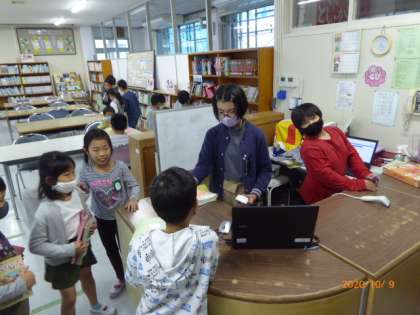 ここのところずっと雨が降り続いています。図書館は今日も人気です。大放課には本の貸し借りに途切れることなく児童が訪れます。