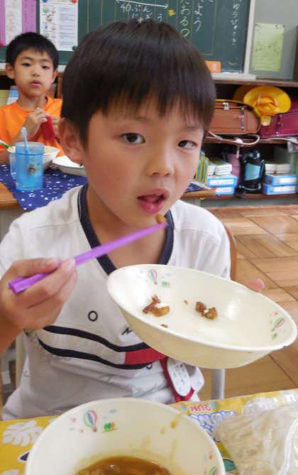 こちらは1年生の教室です。驚いたのは、おはしの使い方のうまさです!!小さな大豆をお箸で上手に口に運ぶことができていました。