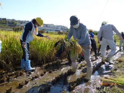 鎌を稲に押し当てて軽く引くだけで簡単に刈れます。刈った稲は近くの農家の方に手渡します。農家の方が受け取ってまとめてくださっています。