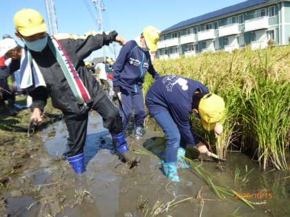 水田のなかですから、足下はぬかるみです。すでに刈ってある切り株のうえに足を乗せると安定します。